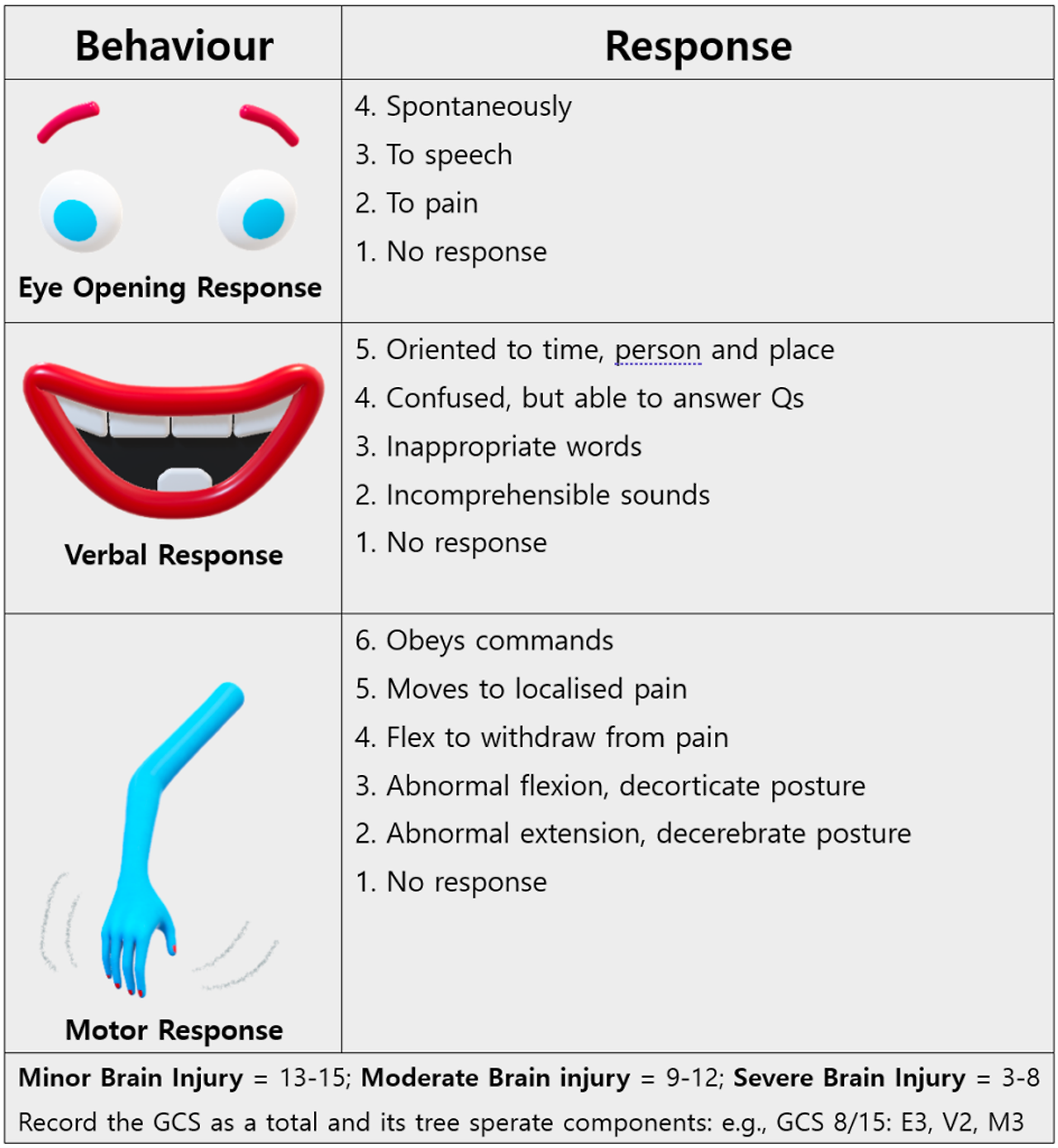 보통 GCS를 확인할 때 환자의 이름을 먼저 부르고, 반응이 없다면 통증을 줘봅니다. 통증을 먼저 준다면 점수가 2점인지 3점인지 구분하기 힘듭니다.